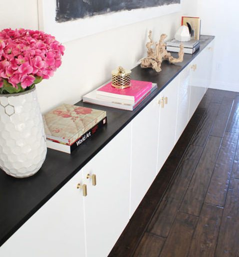 Can you believe this stunning piece is made out of IKEA cabinets? Gold pulls and a sleek black surface gives it an upscale finish.