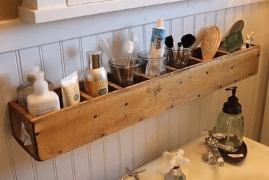A cheap CD tower turned on its side makes for a great bathroom organizer.